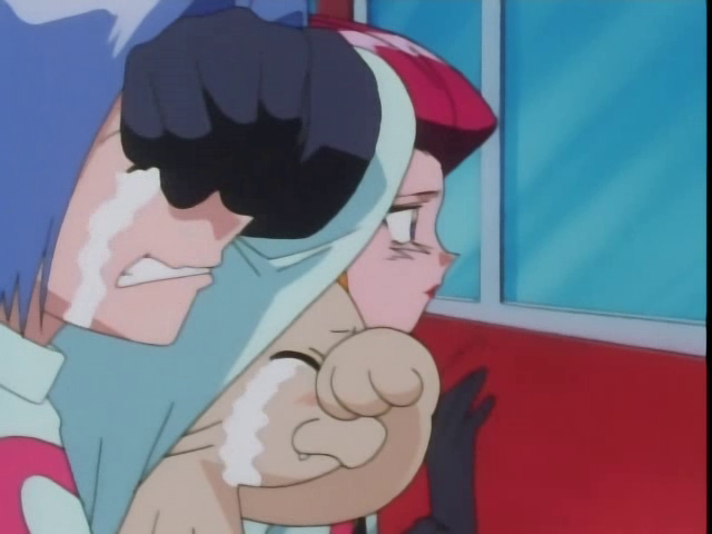 James, Meowth and Jessie are watching and listening from outside. The tender scene makes James cry very manly tears.